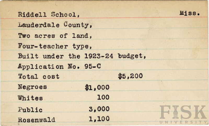 - School card from Rosenwald Fund for Riddell School in Lauderdale County, Mississippi