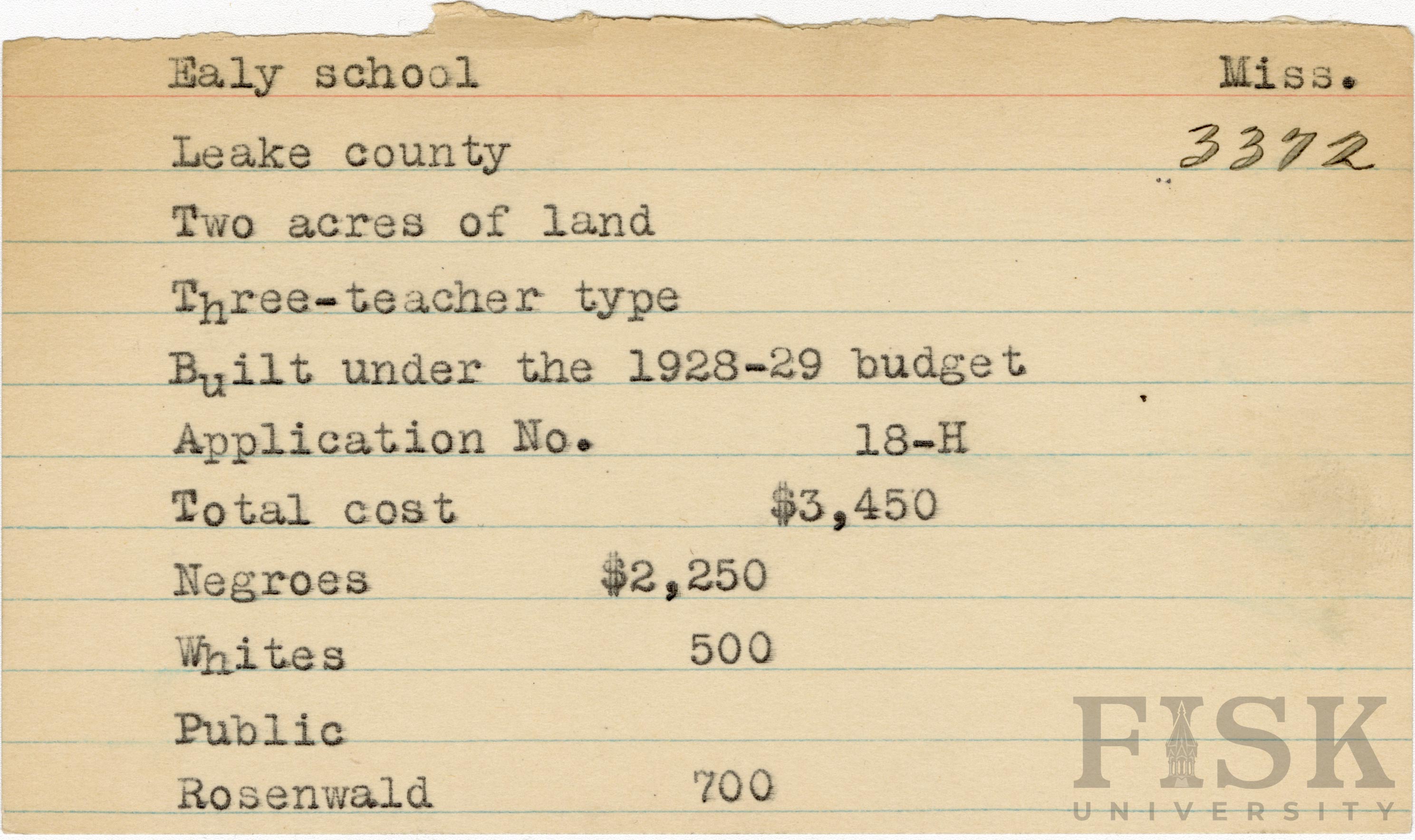 - School card from Rosenwald Fund for Ealy School in Leake County, Mississippi