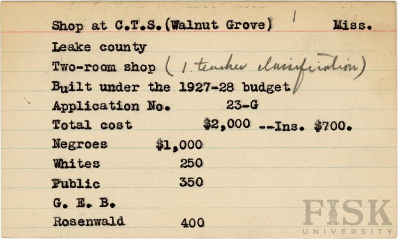 - School card from Rosenwald Fund for the two room shop at Walnut Grove School in Leake County, Mississippi with a section added to the budget contributions that says, "Ins. $700". A section added to the budget contributions says "G.E.B." with no monetary amount added.