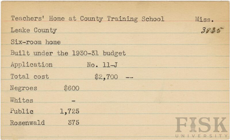 - School card from Rosenwald Fund for the six room home at County Training School in Leake County, Mississippi