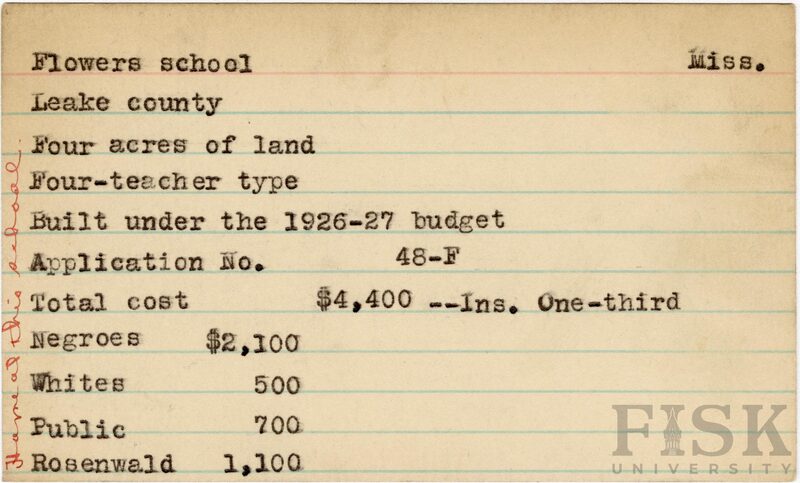 - School card from Rosenwald Fund for Flowers School in Leake County, Mississippi with a section added to the budget contributions that says, "Ins. One-third" and a handwritten note on the far left of the card that says, "Home at this school"