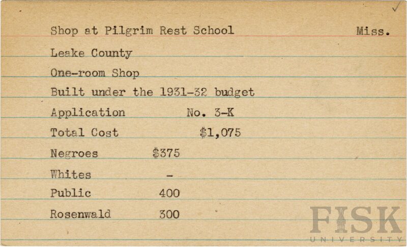 - School card from Rosenwald Fund for the one room shop at Pilgrim Rest School in Leake County, Mississippi