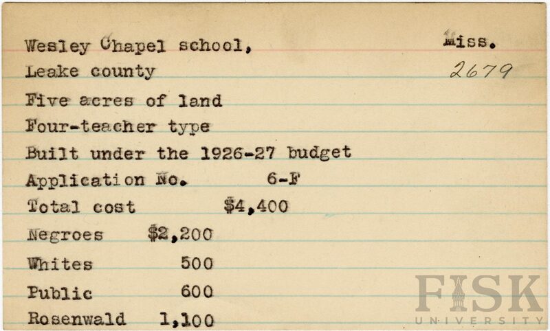 - School card from Rosenwald Fund for Wesley Chapel School in Leake County, Mississippi