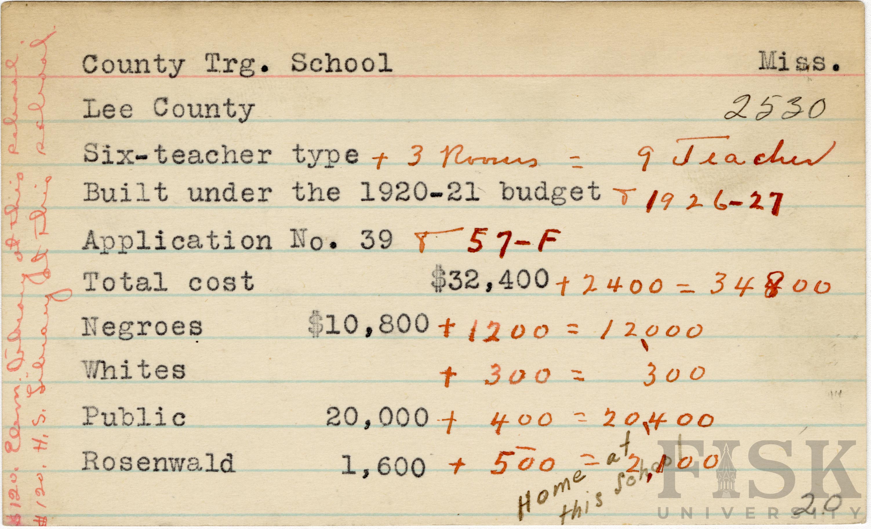 - School card from Rosenwald Fund for County Training School in Lee County, Mississippi with handwritten additions to the teacher type, budget year, application number, and budget contribution sections. Handwritten notes on the card say, "$120 elem library at this school," "$120 H.S. library at this school," and "Home at this school"