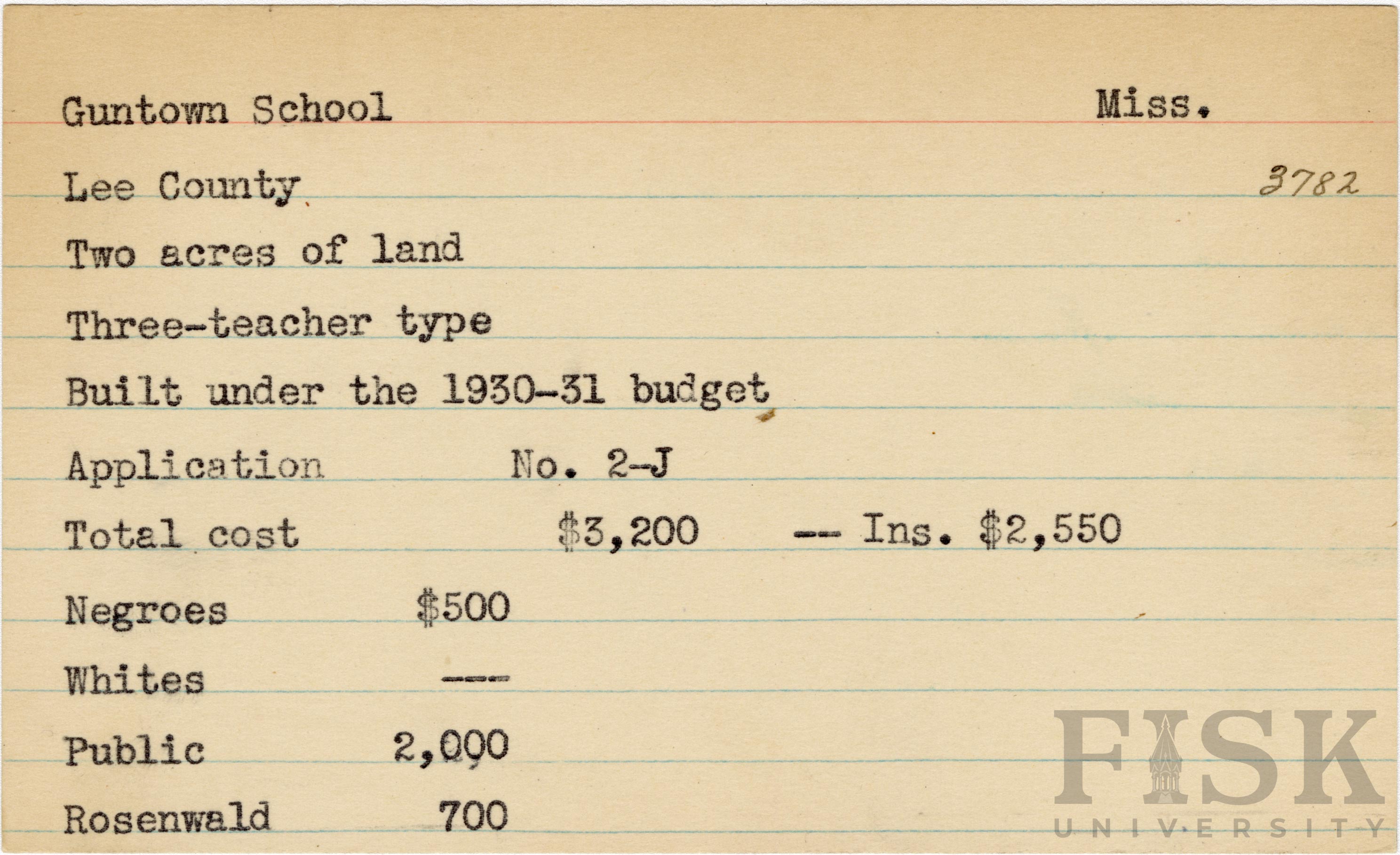 - School card from Rosenwald Fund for Guntown School in Lee County, Mississippi with a section added to the budget contributions that says, "Ins. $2,550"