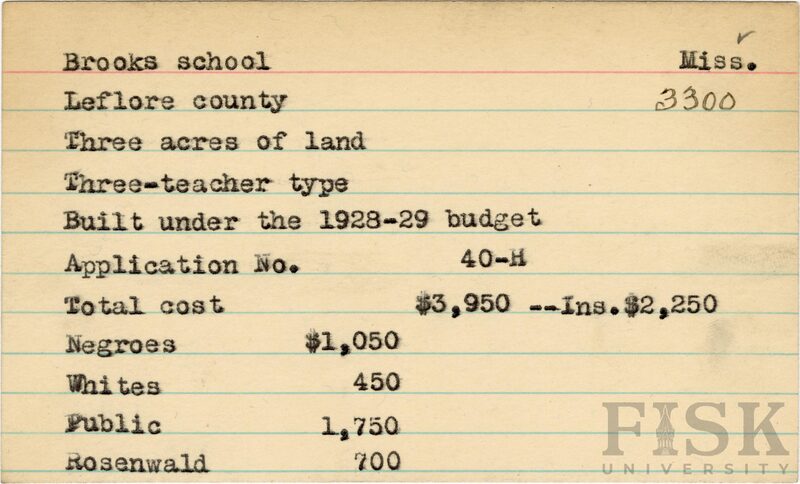 School card from Rosenwald Fund for Brooks School in Leflore County, Mississippi with a section added to the budget contributions that says, "Ins. $2,250"