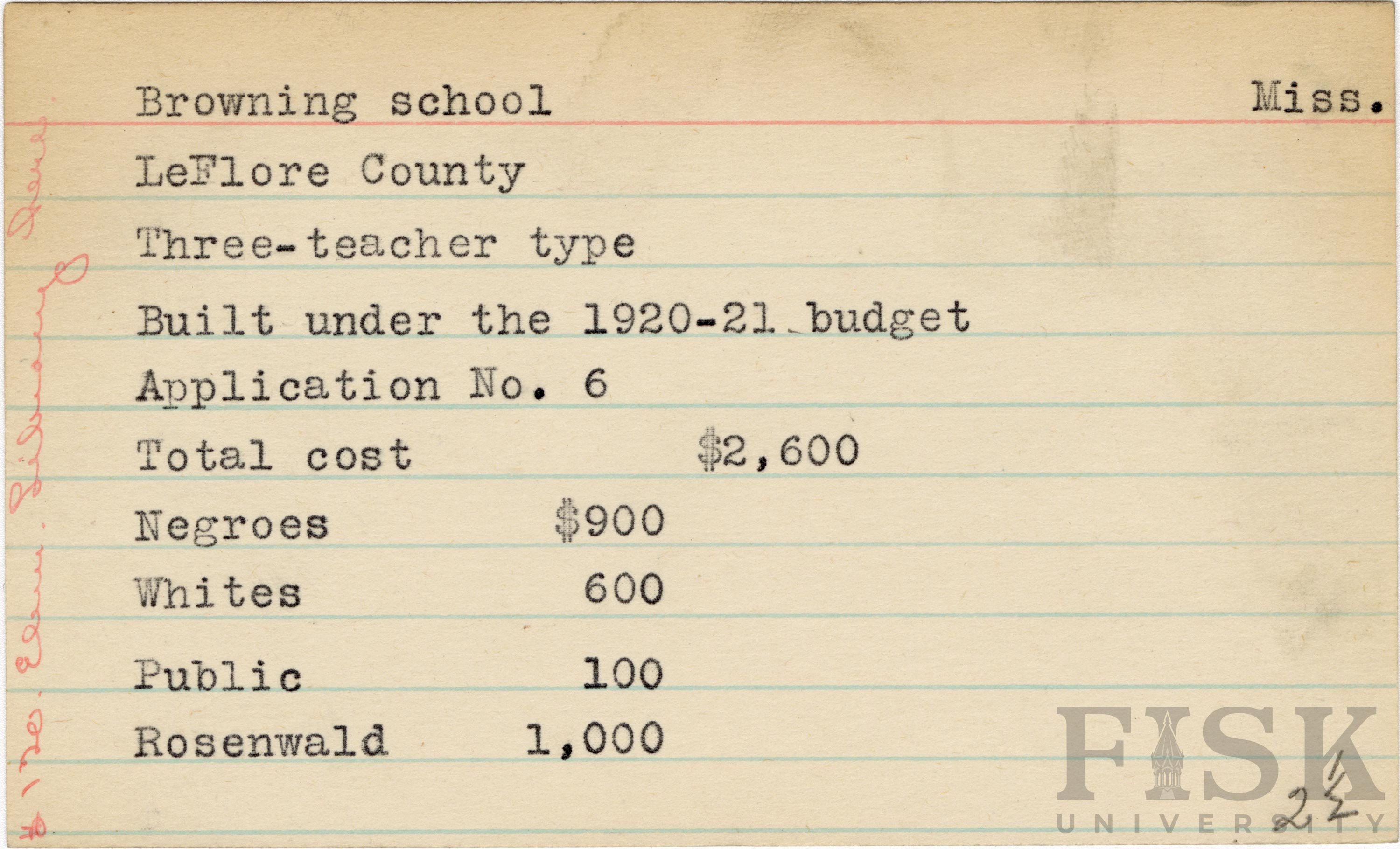 - School card from Rosenwald Fund for Browning School in Leflore County, Mississippi with a handwritten note on the far left of the card that says, "$120 elem library here"
