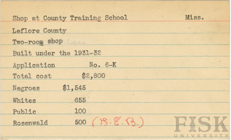 - School card from Rosenwald Fund for the two room shop at County Training School in Leflore County, Mississippi with a handwritten note next to the Rosenwald budget contribution that says, "(G.E.B.)"