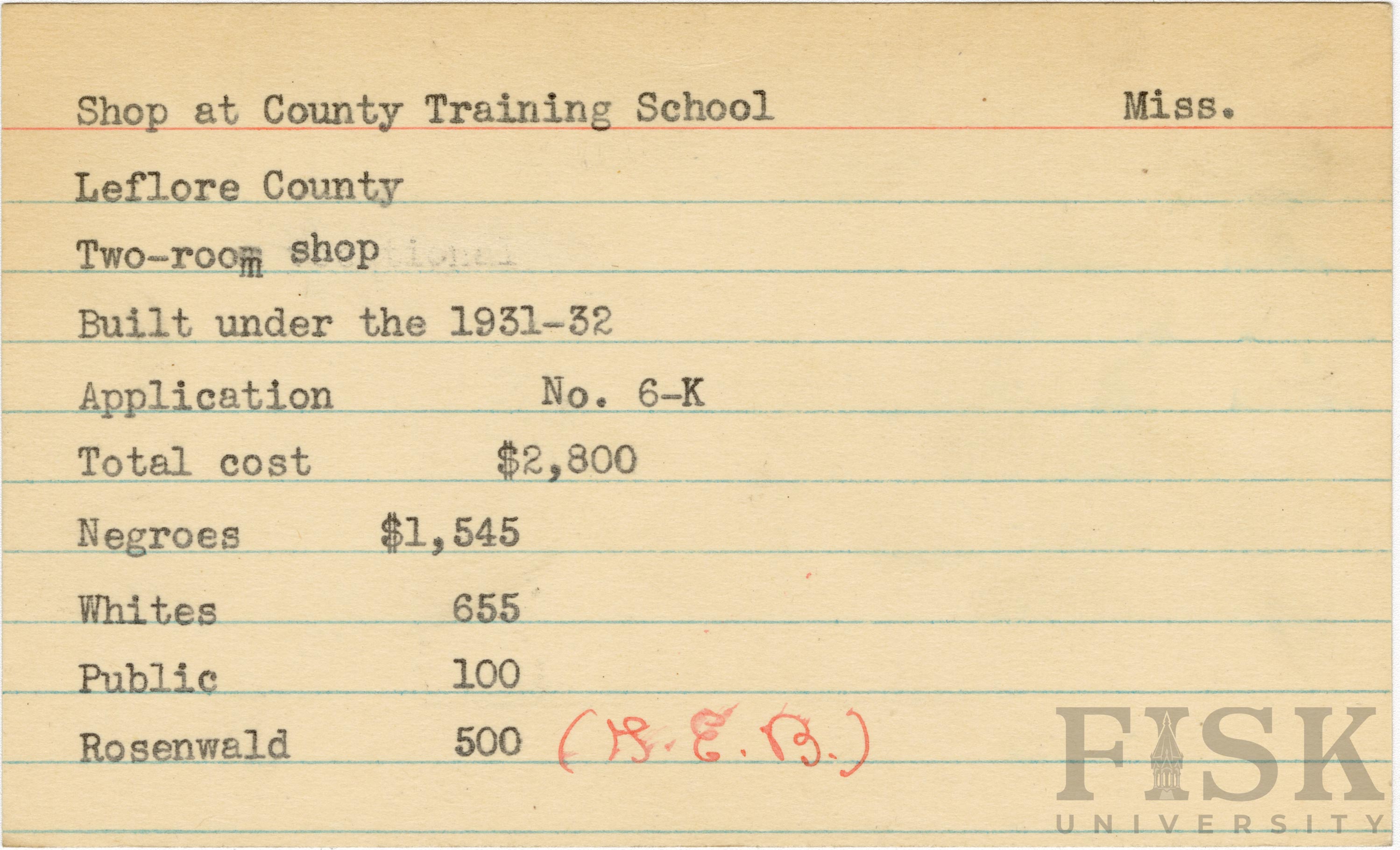 School card from Rosenwald Fund for the two room shop at County Training School in Leflore County, Mississippi with a handwritten note next to the Rosenwald budget contribution that says, "(G.E.B.)"