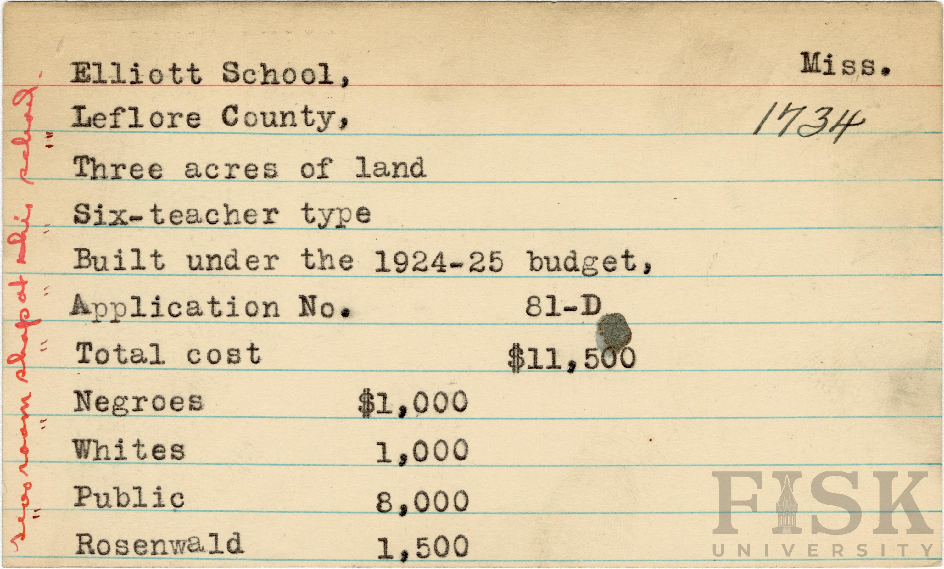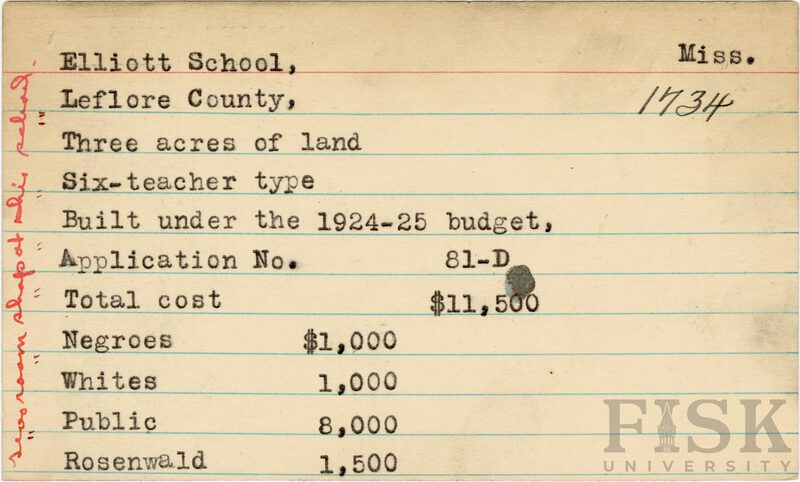 - School card from Rosenwald Fund for Elliott School in Leflore County, Mississippi with a handwritten note on the far left of the card that says, "two room shop at this school"