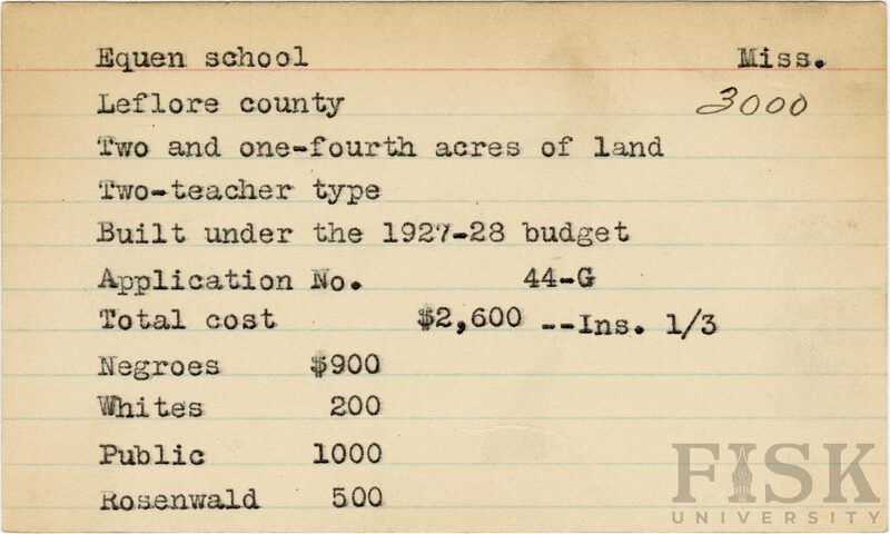 - School card from Rosenwald Fund for Equen School in Leflore County, Mississippi with a section added to the budget contributions that says, "Ins. 1/3"