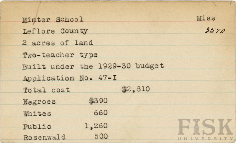 - School card from Rosenwald Fund for Minter School in Leflore County, Mississippi