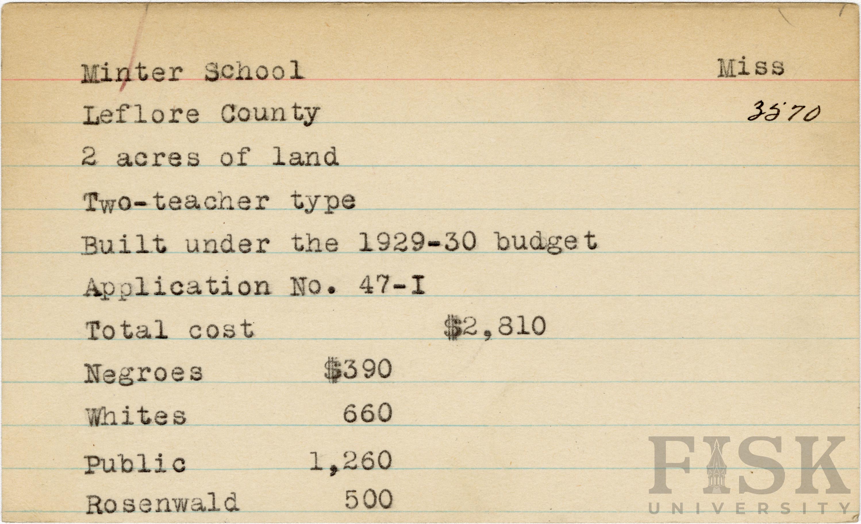 School card from Rosenwald Fund for Minter School in Leflore County, Mississippi