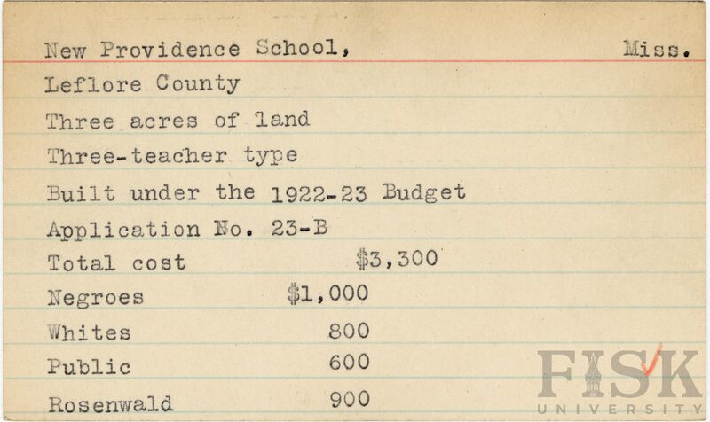 - School card from Rosenwald Fund for New Providence School in Leflore County, Mississippi