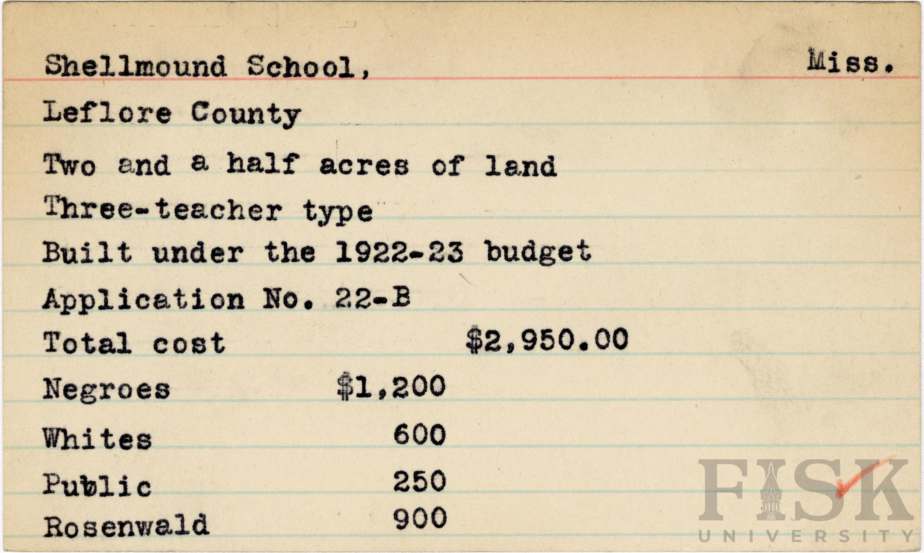- School card from Rosenwald Fund for Shellmound School in Leflore County, Mississippi
