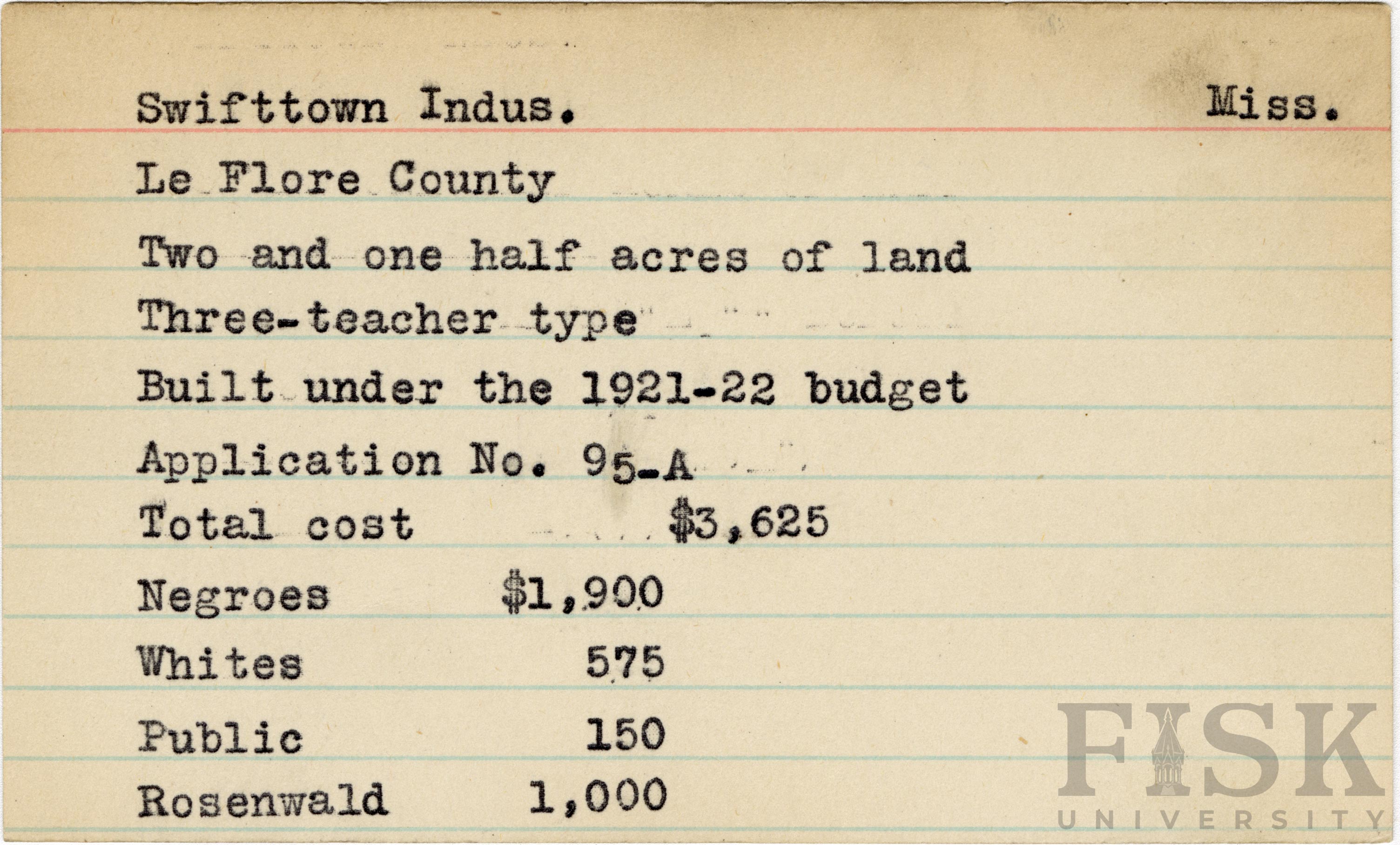 - School card from Rosenwald Fund for Swifttown Industrial School in Leflore County, Mississippi