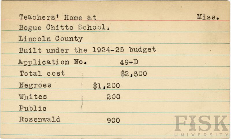 - School card from Rosenwald Fund for the teacher's home at Bogue Chitto School in Lincoln County, Mississippi