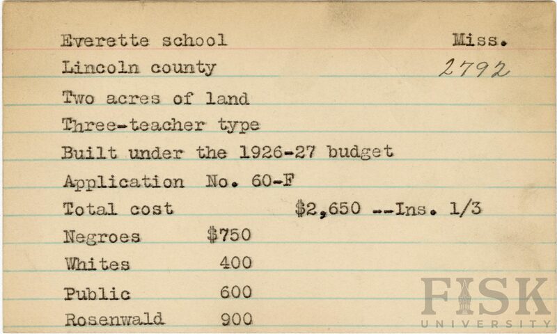 - School card from Rosenwald Fund for Everette School in Lincoln County, Mississippi with a section added to the budget contributions that says, "Ins. 1/3"
