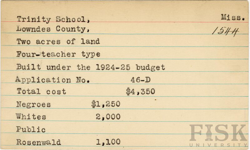 - School card from Rosenwald Fund for Trinity School in Lowndes County, Mississippi
