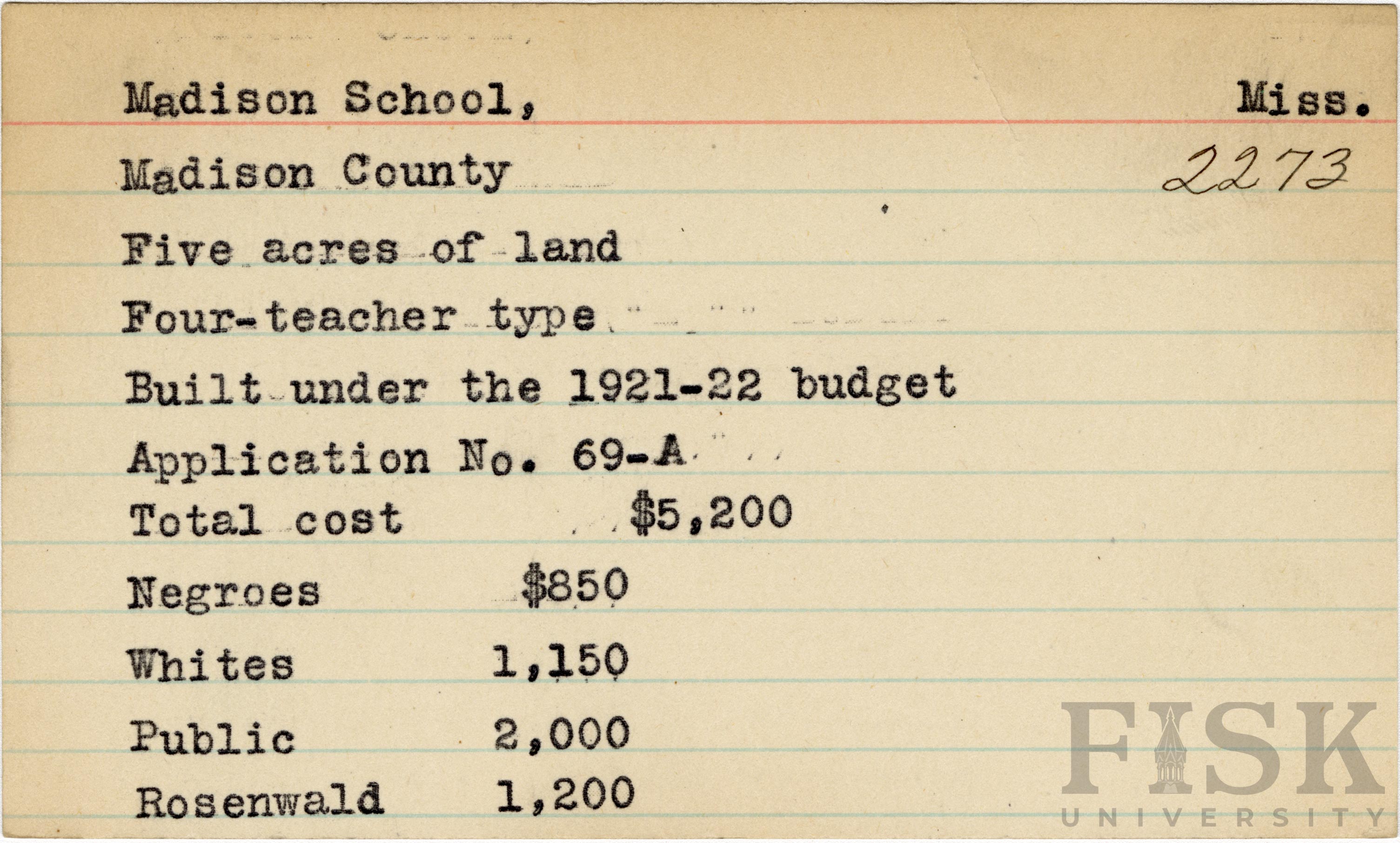 - School card from Rosenwald Fund for Madison School in Madison County, Mississippi