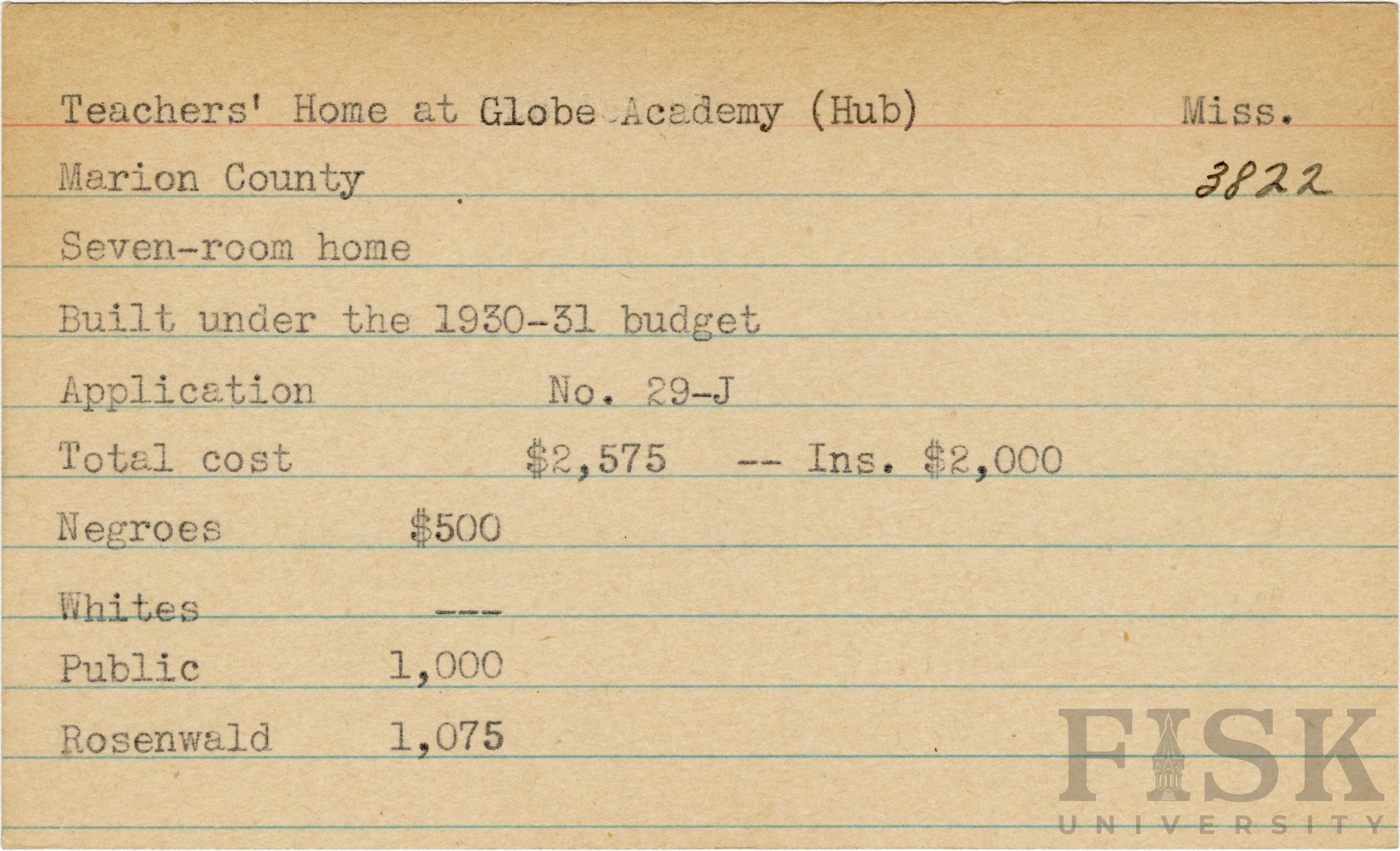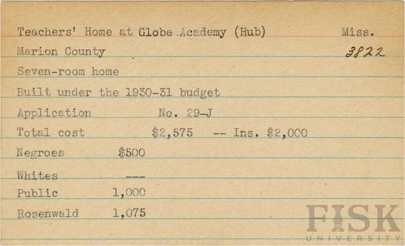 - School card from Rosenwald Fund for the seven room teacher's home at Globe Academy (Hub) in Marion County, Mississippi with a section added to the budget contributions that says, "Ins. $2,000"