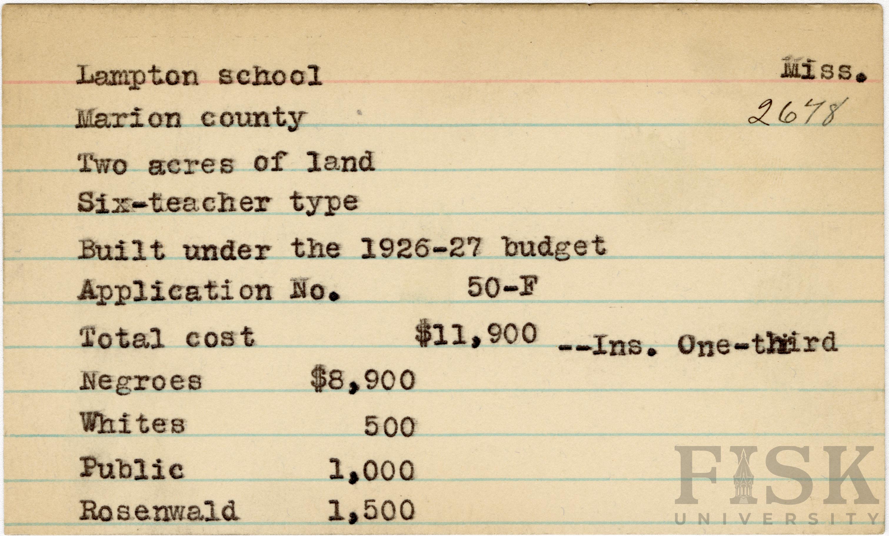 - School card from Rosenwald Fund for Lampton School in Marion County, Mississippi with a section added to the budget contributions that says, "Ins. One-third"