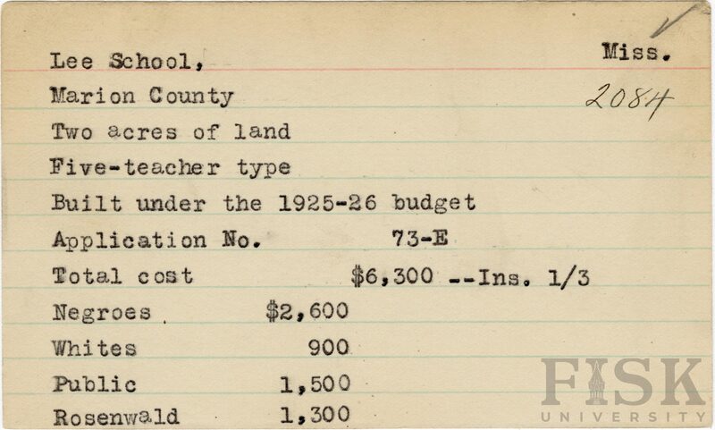 - School card from Rosenwald Fund for Lee School in Marion County, Mississippi with a section added to the budget contributions that says, "Ins. 1/3"