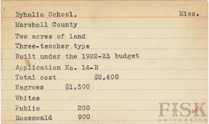- School card from Rosenwald Fund for Byhalia School in Marshall County, Mississippi