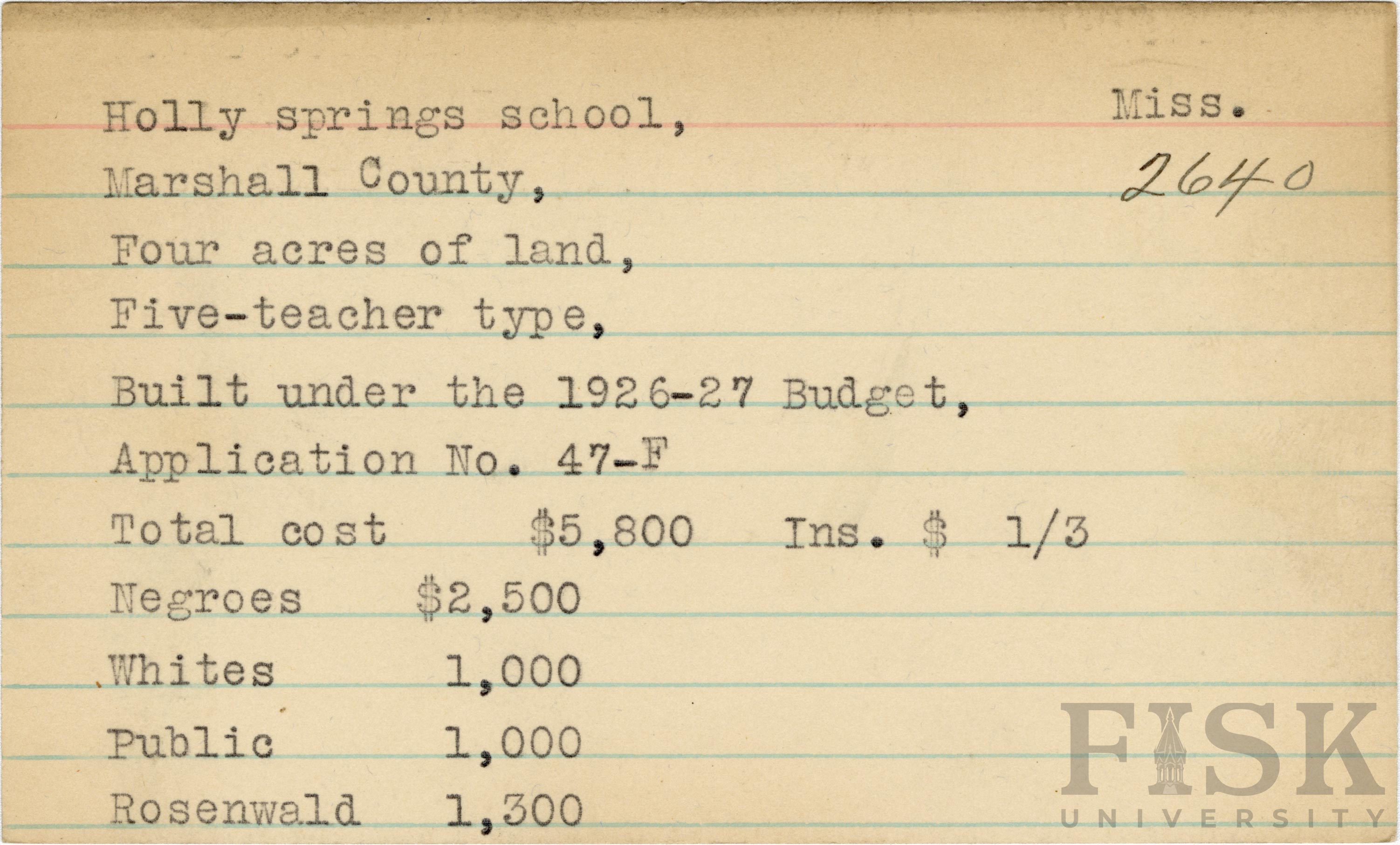 School card from Rosenwald Fund for Holly Springs School in Marshall County, Mississippi with a section added to the budget contributions that says, "Ins. $1/3"