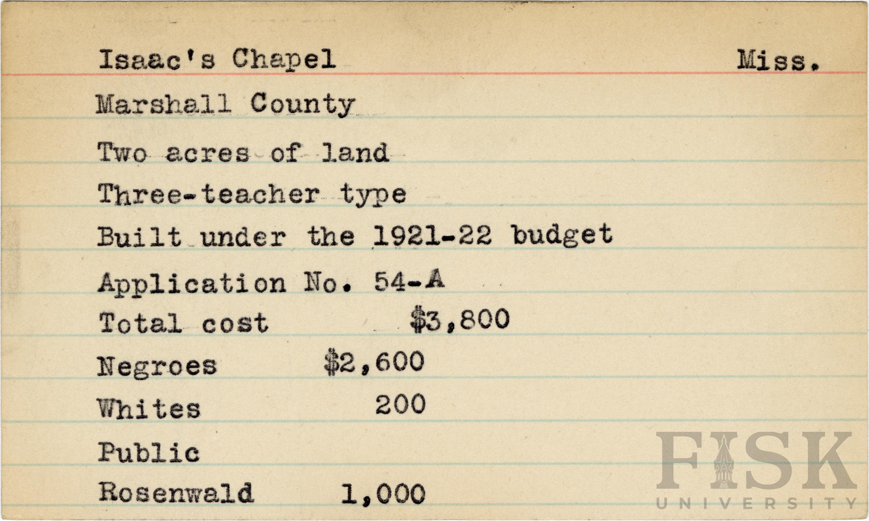 - School card from Rosenwald Fund for Isaac's Chapel School in Marshall County, Mississippi