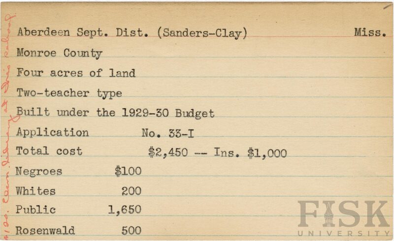 - School card from Rosenwald Fund for Aberdeen Sept. Dist. in Monroe County, Mississippi with a section added to the budget contributions that says, "Ins. $1,000" with a handwritten note on the far left of the card that says, "$120 elem library at this school"