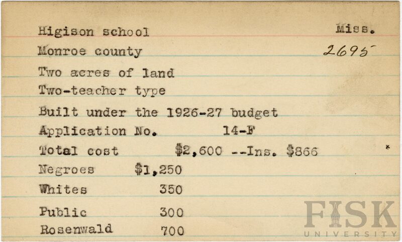 - Julius Rosenwald Fund, Julius Rosenwald Fund--Buildings, African American schools--History--20th century, African American schools -- Higison School