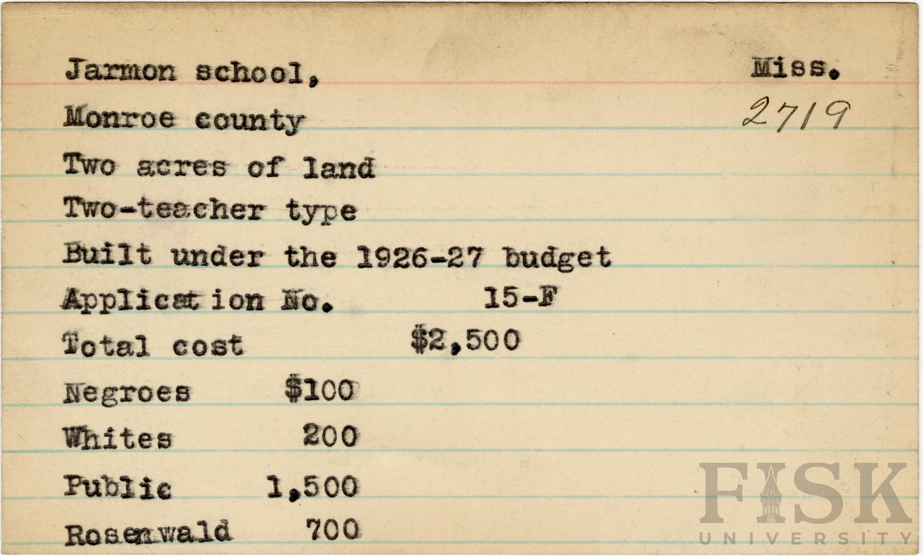 - School card from Rosenwald Fund for Jarmon School in Monroe County, Mississippi