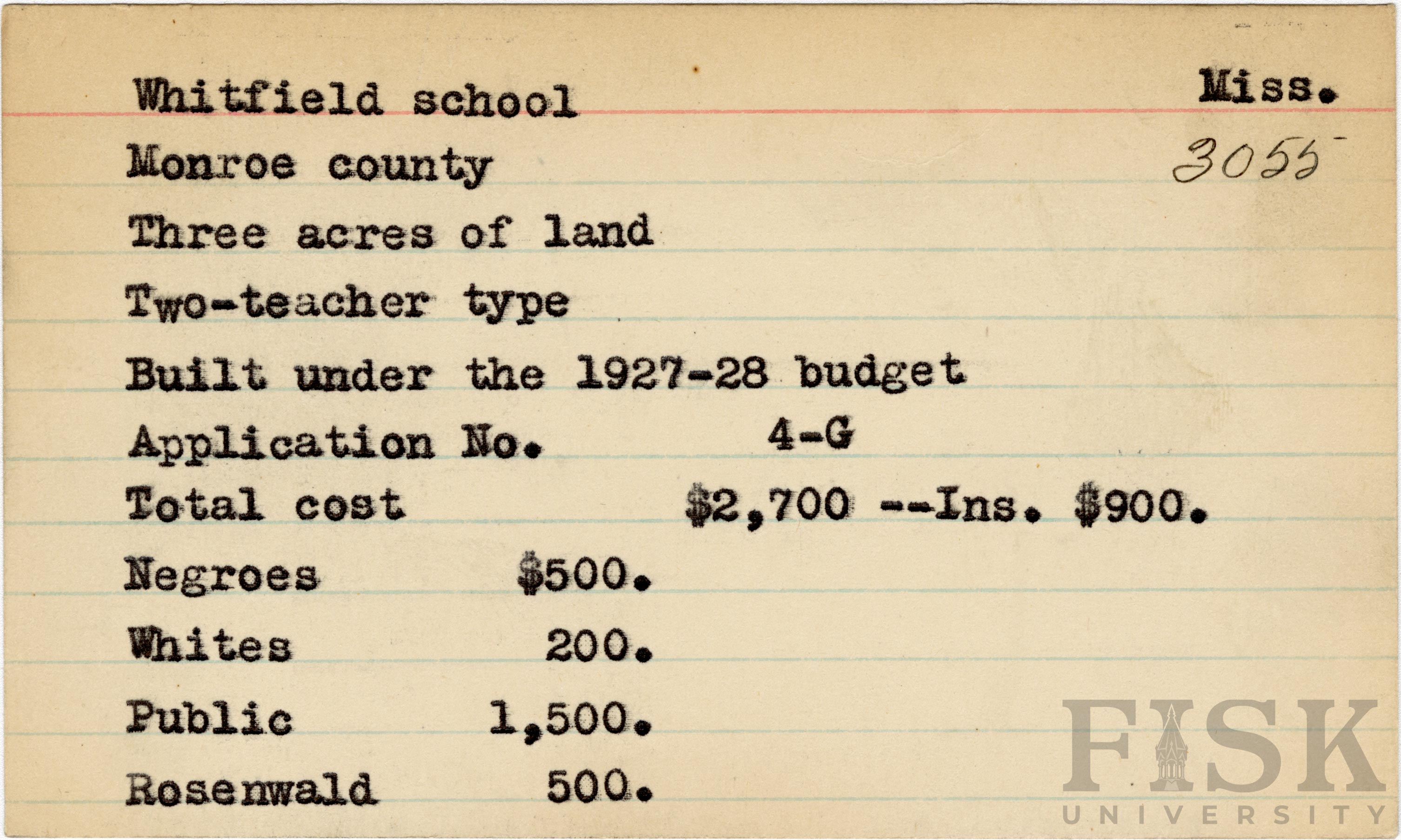- School card from Rosenwald Fund for Whitfield School in Monroe County, Mississippi with a section added to the budget contributions that says, "Ins. $900"
