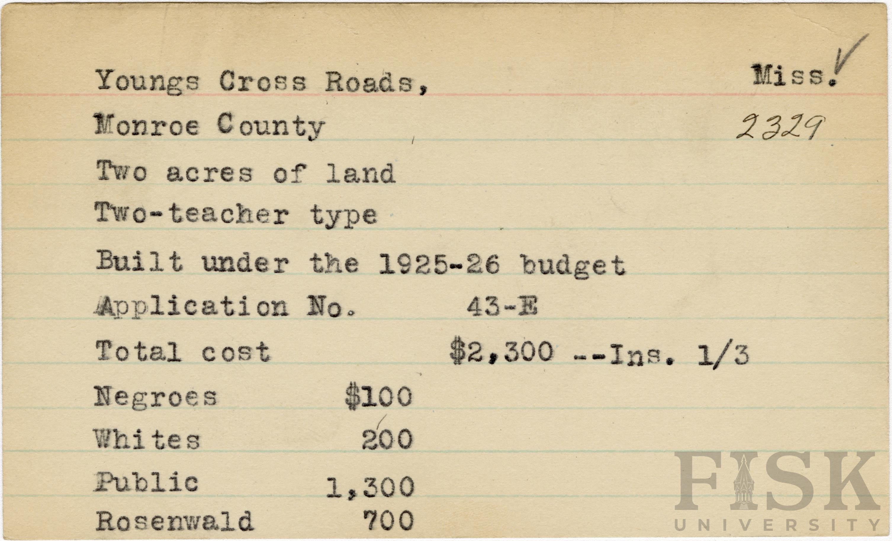 - School card from Rosenwald Fund for Youngs Cross Roads School in Monroe County, Mississippi with a section added to the budget contributions that says, "Ins. 1/3"