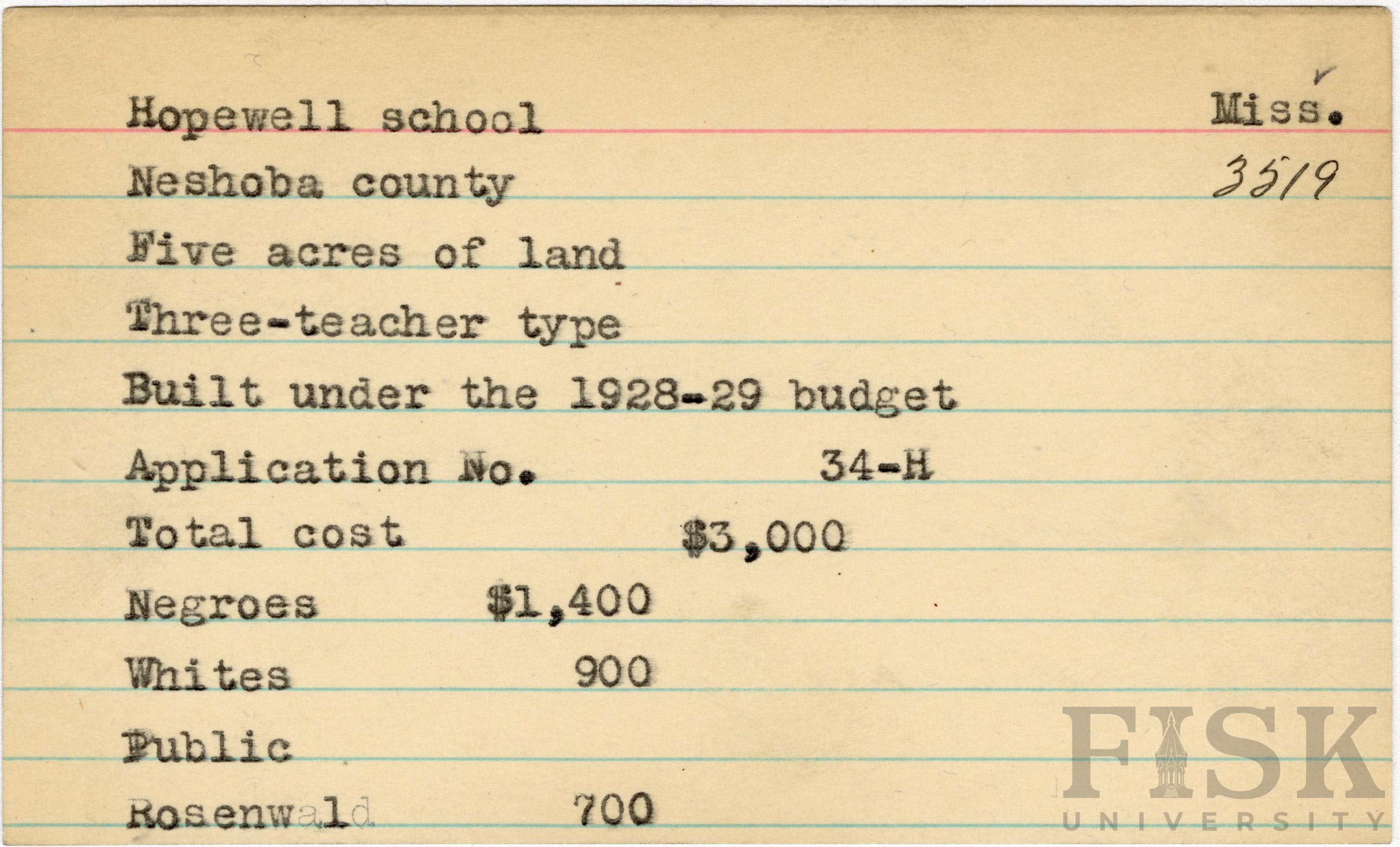 - School card from Rosenwald Fund for Hopewell School in Neshoba County, Mississippi