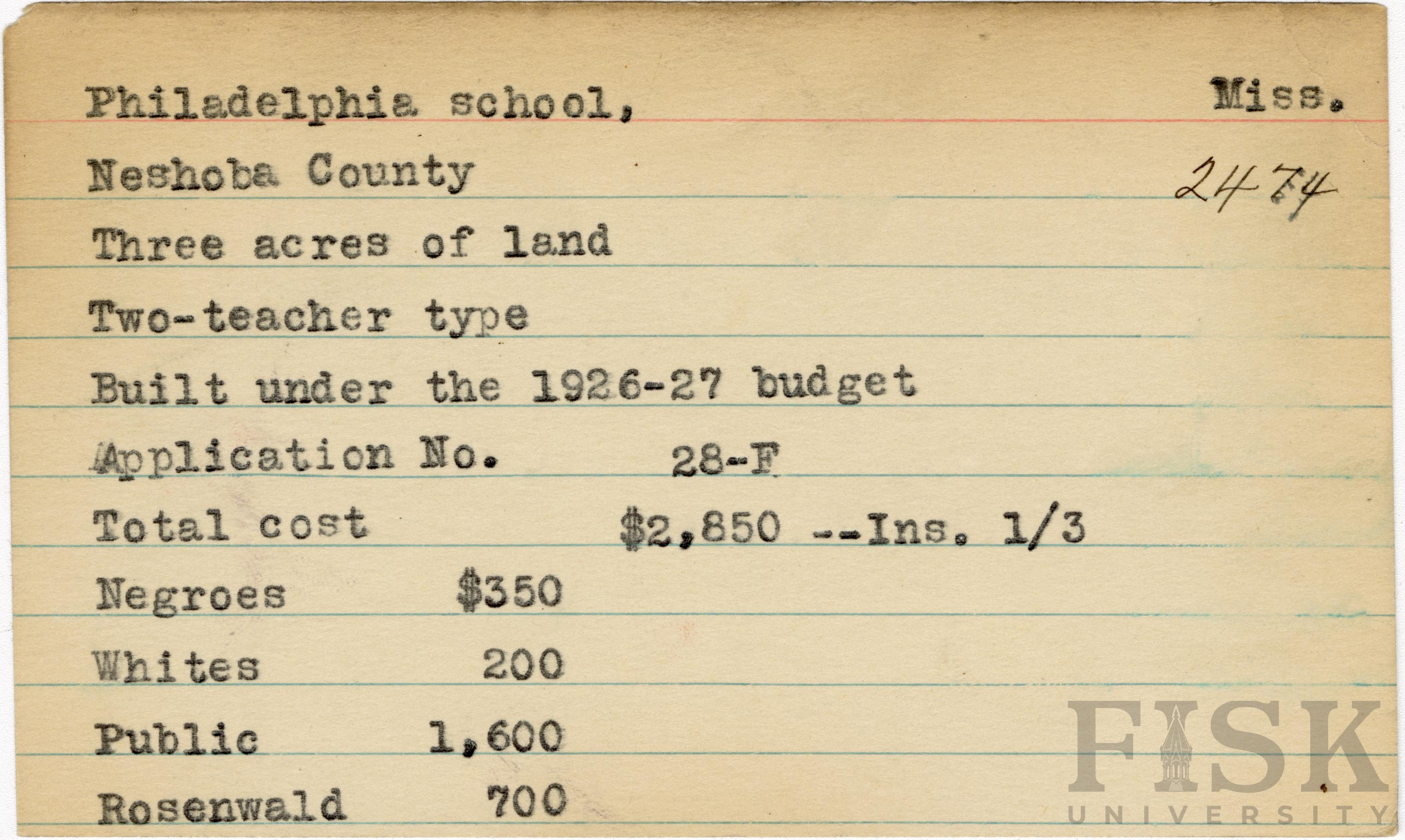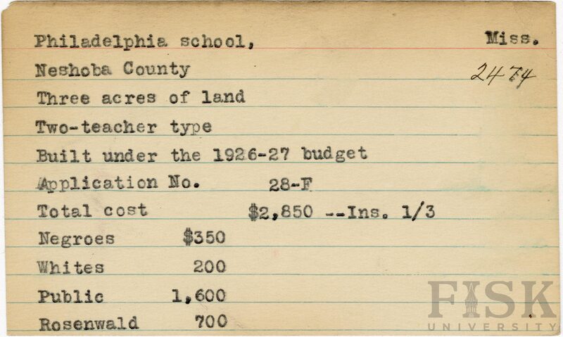 - School card from Rosenwald Fund for Philadelphia School in Neshoba County, Mississippi with a section added to the budget contributions that says, "Ins. 1/3"