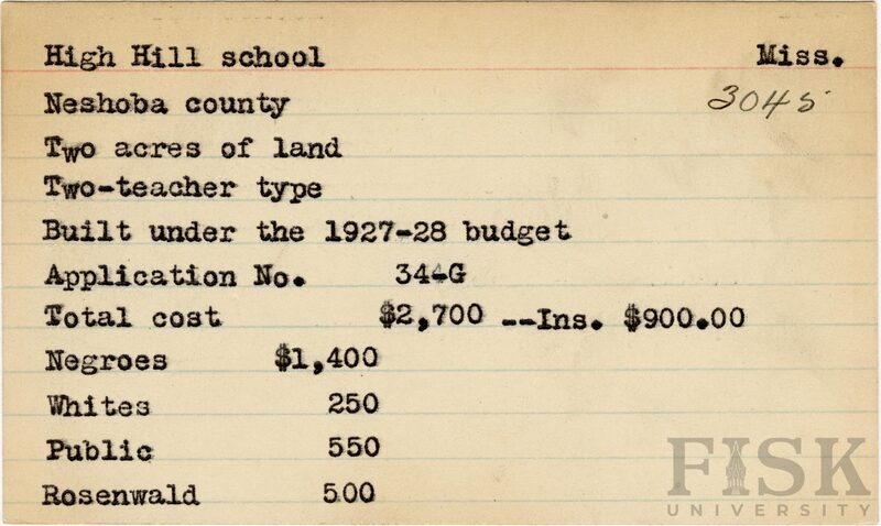 - School card from Rosenwald Fund for High Hill School in Neshoba County, Mississippi with a section added to the budget contributions that says, "Ins. $900.00"