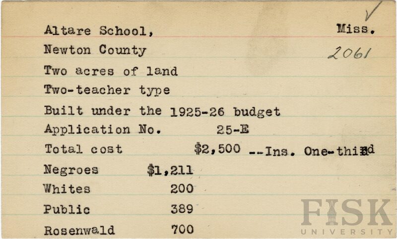 - School card from Rosenwald Fund for Altare School in Newton County, Mississippi with a section added to the budget contributions that says, "Ins. One-third"