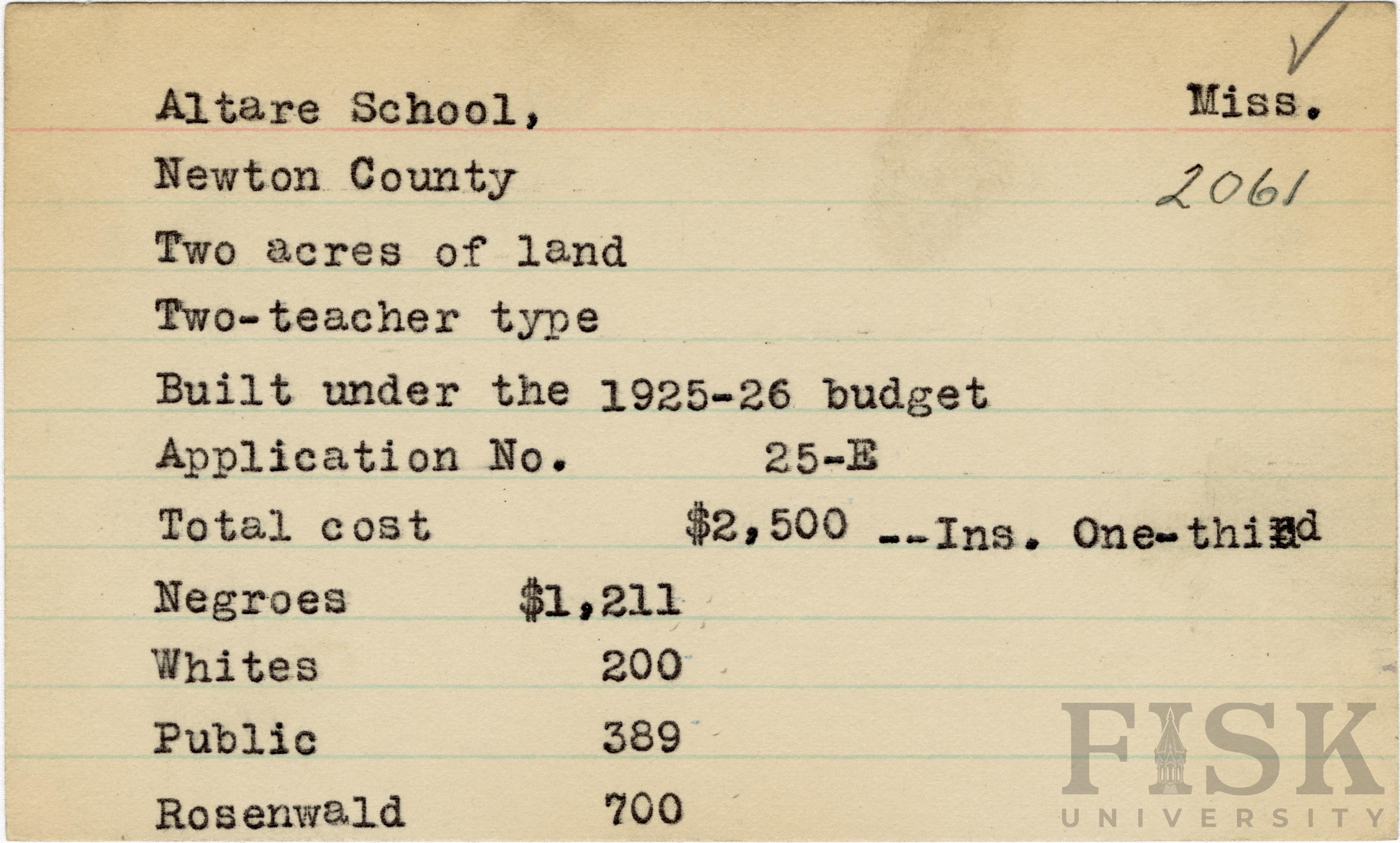 - Julius Rosenwald Fund, Julius Rosenwald Fund--Buildings, African American schools--History--20th century, African American schools -- Altare School