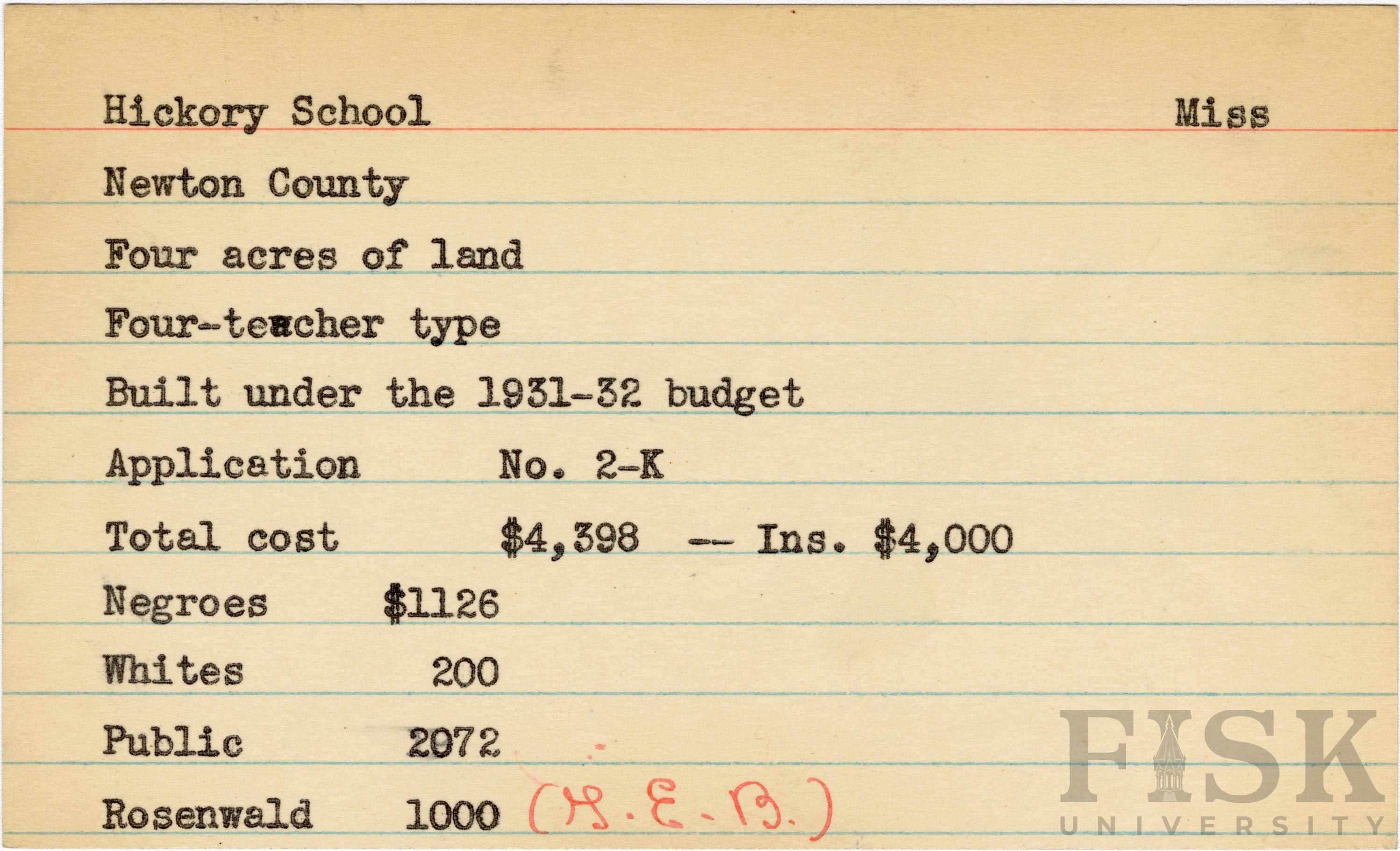 School card from Rosenwald Fund for Hickory School in Newton County, Mississippi with a section added to the budget contributions that says, "Ins. $4,000" and "(G.E.B.)" handwritten next to the Rosenwald budget contribution.