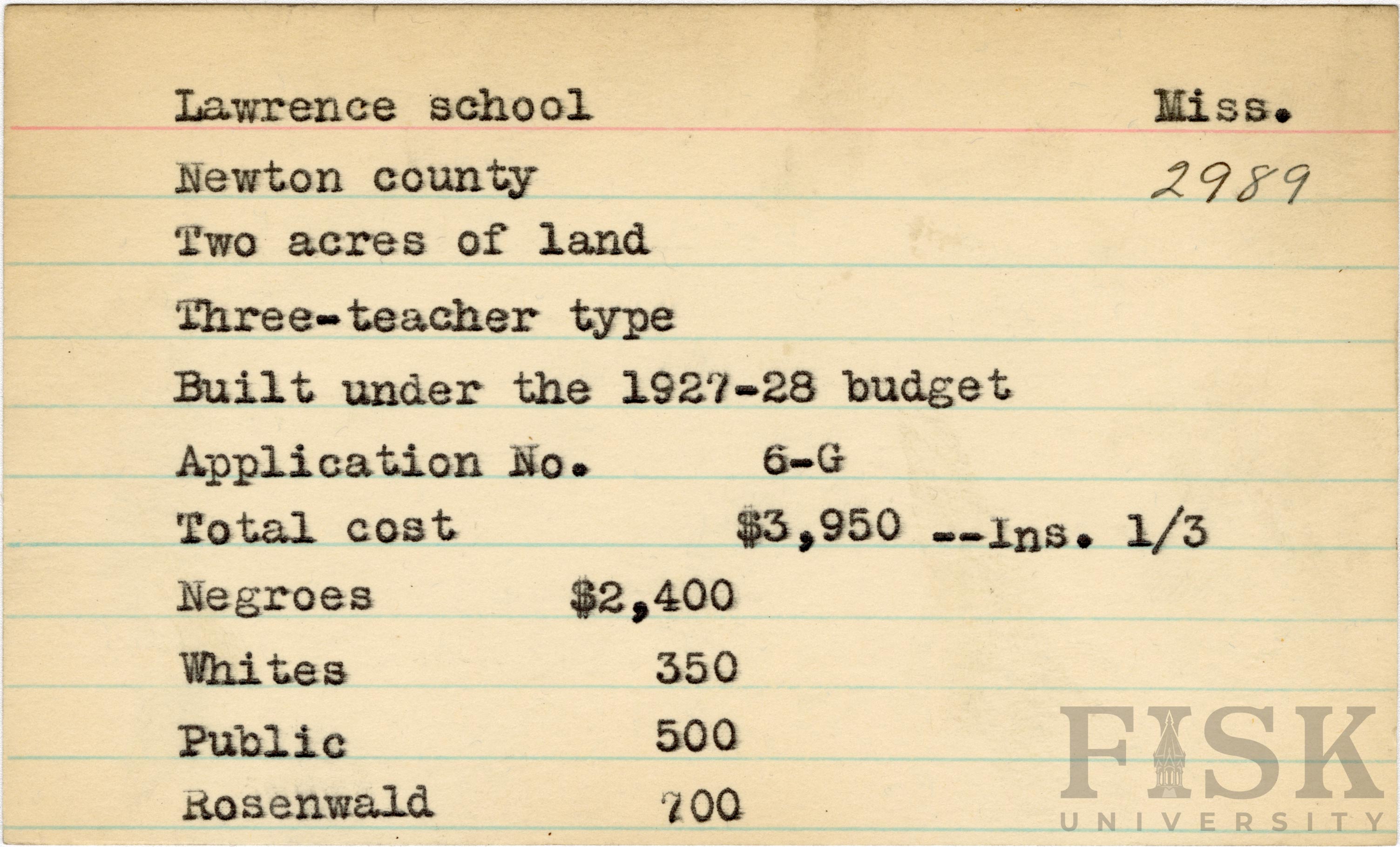 - School card from Rosenwald Fund for Lawrence School in Newton County, Mississippi with a section added to the budget contributions that says, "Ins. 1/3"
