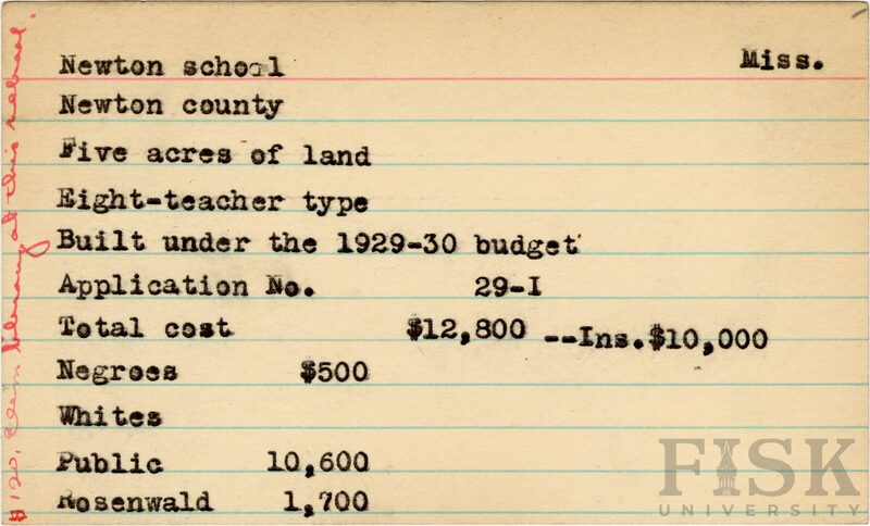 - School card from Rosenwald Fund for Newton School in Newton County, Mississippi with a section added to the budget contributions that says, "Ins. $10,000" and a handwritten note on the far left of the card that says, "$120 elem library at this school"