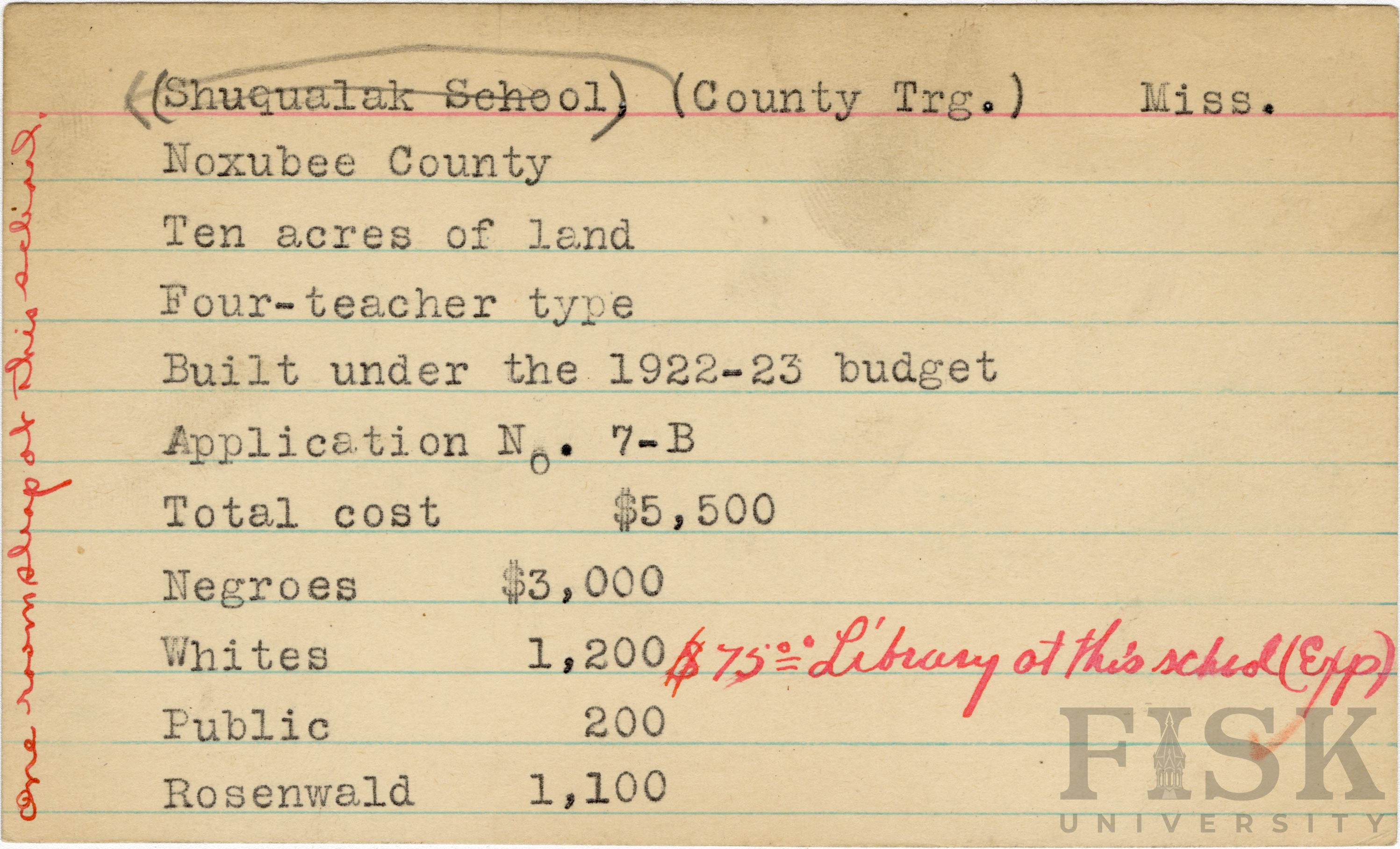 - School card from Rosenwald Fund for County Training School in Noxubee County, Mississippi with handwritten notes on the card that say, "$75.00 library at this school (Exp)" and "one room shop at this school"