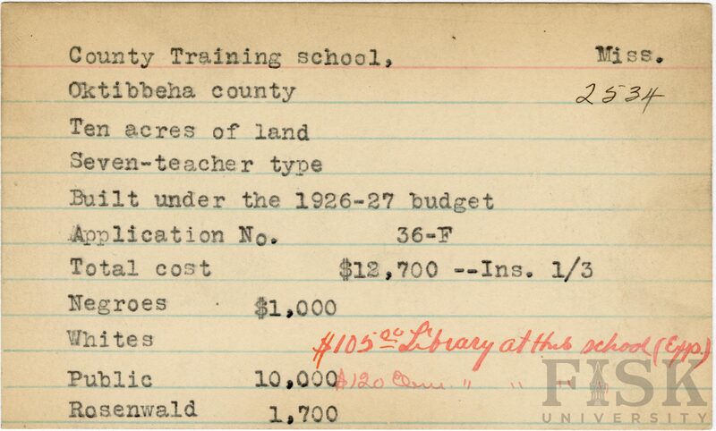 - School card from Rosenwald Fund for County Training School in Oktibbeha County, Mississippi with a section added to the budget contributions that says, "Ins. 1/3". Handwritten notes on the card that say, "$105.00 library at this school (Exp)" and "$120 elem library at this school"