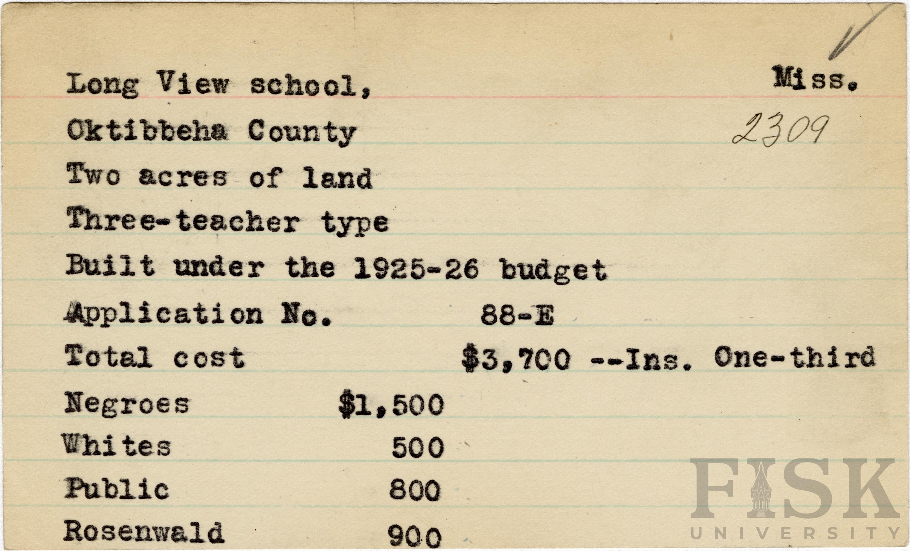 - School card from Rosenwald Fund for Long View School in Oktibbeha County, Mississippi with a section added to the budget contributions that says, "Ins. One-third"