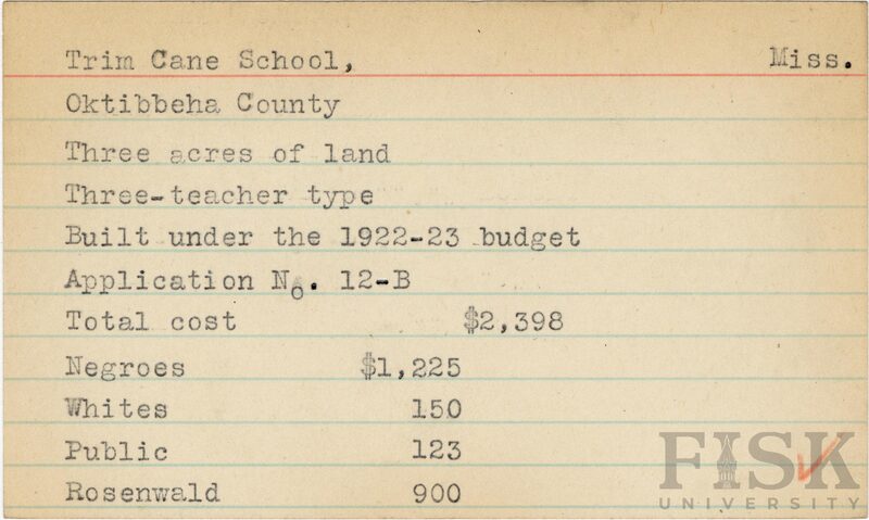 - School card from Rosenwald Fund for Trim Cane School in Oktibbeha County, Mississippi