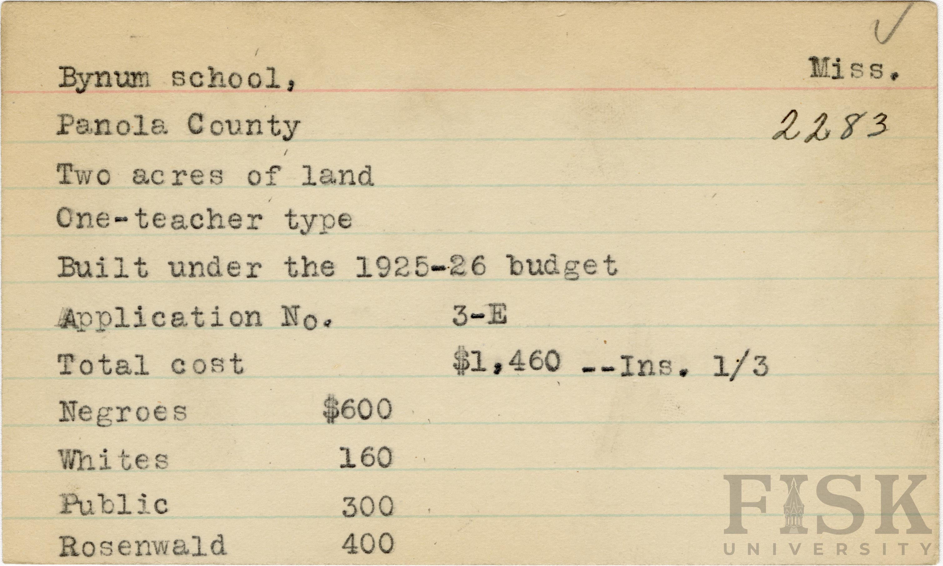 - School card from Rosenwald Fund for Bynum School in Panola County, Mississippi with a section added to the budget contributions that says, "Ins. 1/3"
