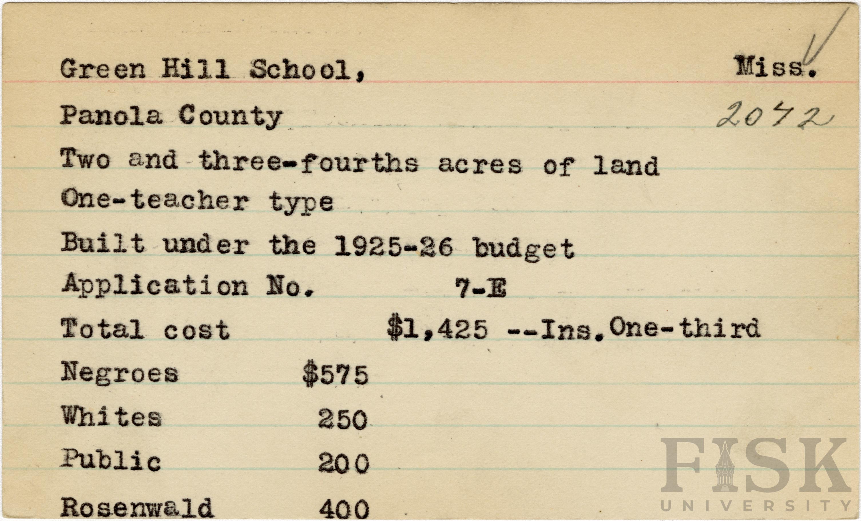- Julius Rosenwald Fund, Julius Rosenwald Fund--Buildings, African American schools--History--20th century, African American schools -- Green Hill School