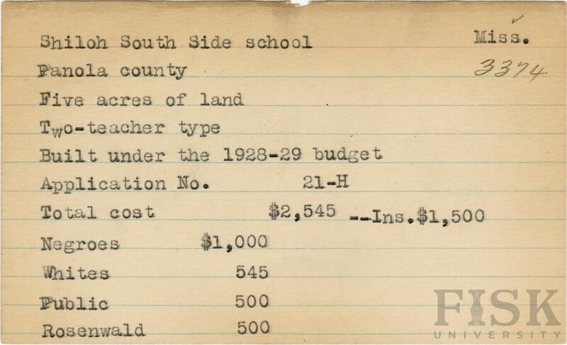 - School card from Rosenwald Fund for Shiloh South Side School in Panola County, Mississippi with a section added to the budget contributions that says, "Ins. $1,500"